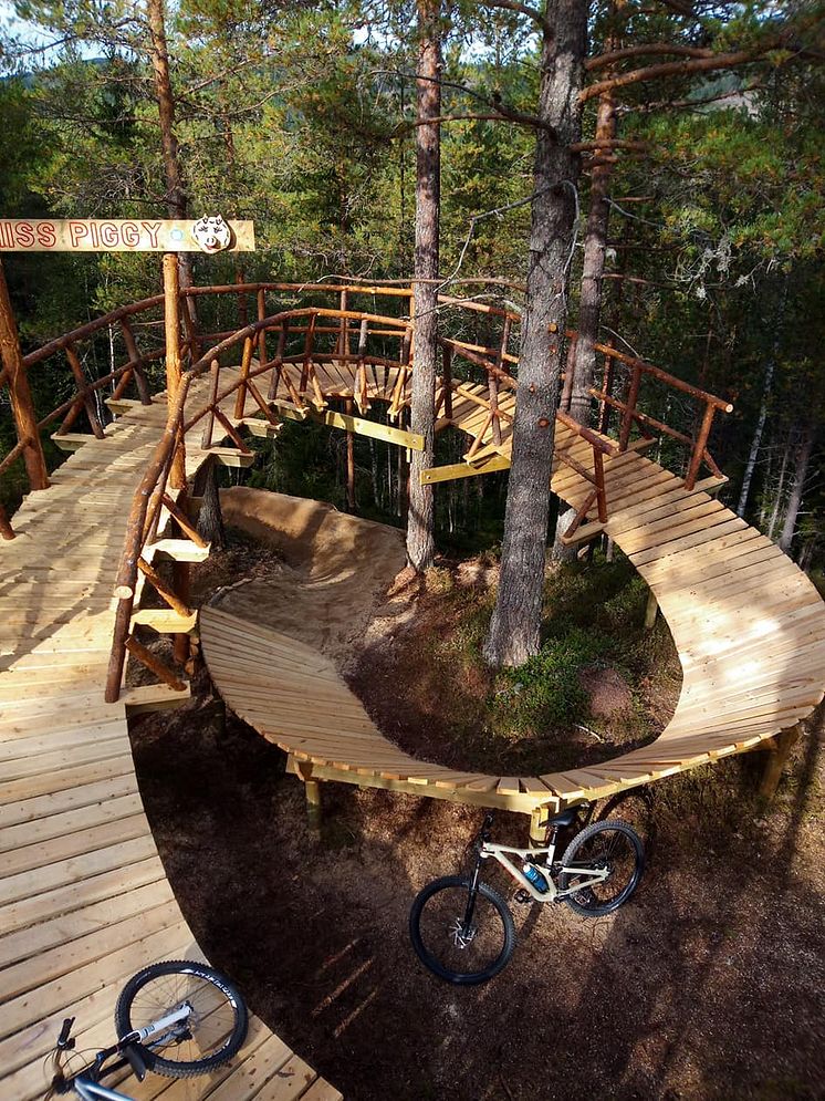 - Miss Piggy har fått sitt navn fra en stor, bygget trekonstruksjon som ser ut som en grisehale, der du først sykler over stien og så under den igjen, sier Olve Norderhaug, prosjektleder for byggingen i Trysil Bike Arena. Det er foreløpig ingen i Skandinavia som har bygget noe lignende sykkelelement.