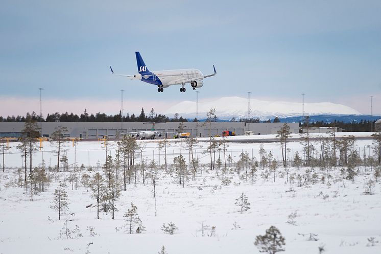 Her lander en SAS-maskin på Scandinavian Mountains Airport i fjor vinter. Foto: Ola Matsson